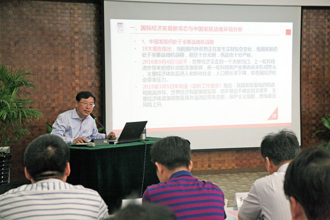上午,陳教授做了“十九大后中國(guó)經(jīng)濟(jì)發(fā)展趨勢(shì)分析”的專題報(bào)告,結(jié)合十九大后國(guó)內(nèi)外經(jīng)濟(jì)發(fā)展新形勢(shì),在對(duì)國(guó)際經(jīng)濟(jì)發(fā)展新常態(tài)與中國(guó)發(fā)展戰(zhàn)略環(huán)境內(nèi)在聯(lián)系研究基礎(chǔ)上,深入分析了十九大后國(guó)內(nèi)經(jīng)濟(jì)發(fā)展走勢(shì)與改革走向。下午,陳教授做了“國(guó)資國(guó)企改革的難點(diǎn)熱點(diǎn)分析”的專題報(bào)告,結(jié)合近幾年國(guó)資國(guó)企改革政策及國(guó)內(nèi)國(guó)企整體發(fā)展現(xiàn)狀,提出學(xué)習(xí)貫徹十九大精神,進(jìn)一步加快國(guó)資國(guó)企改革的必要性,在此基礎(chǔ)上,深入介紹了深化國(guó)資國(guó)企改革的具體內(nèi)容與發(fā)展趨勢(shì)。